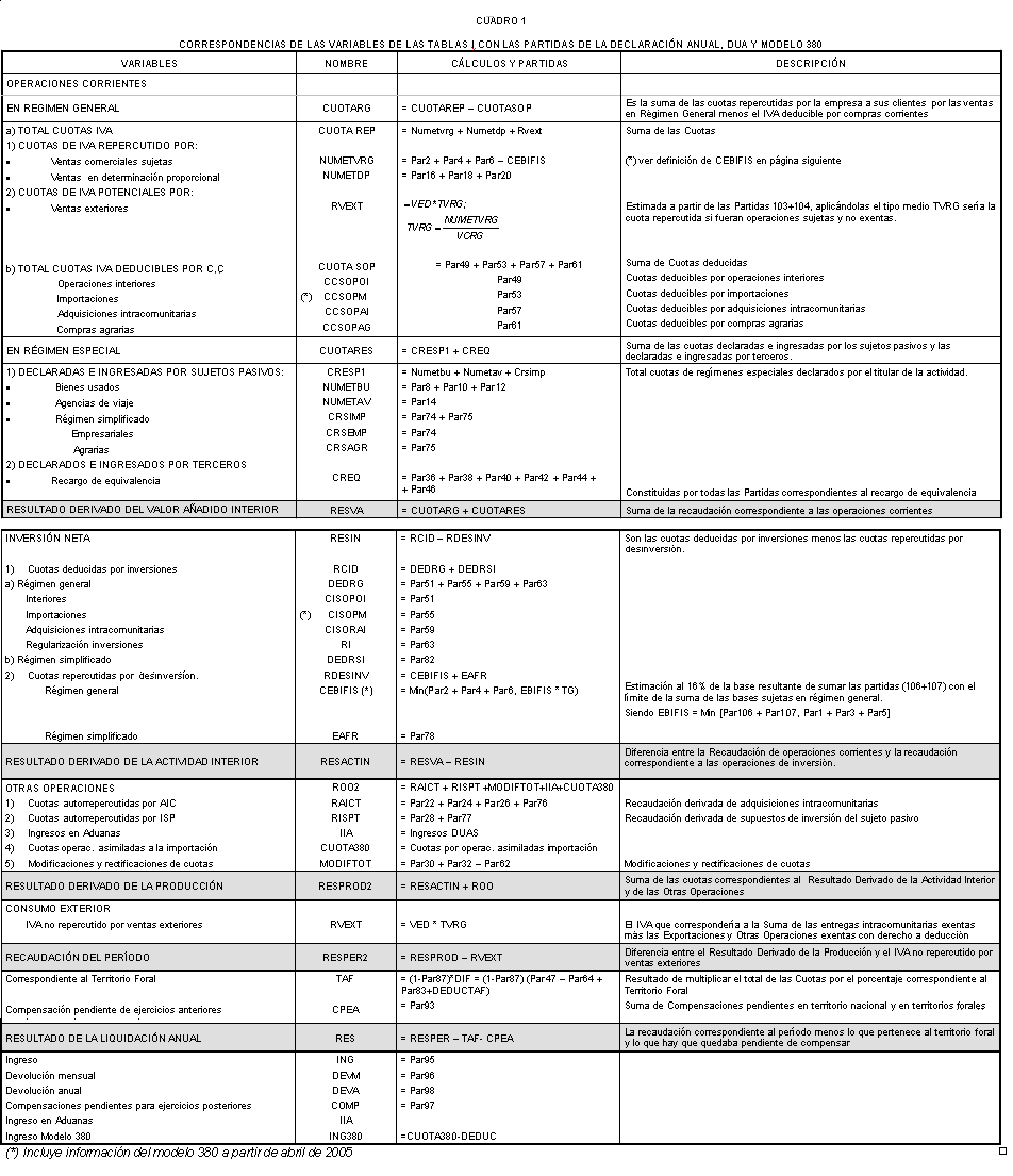 Se consideran variables de análisis originales las que aparecen directamente en los modelos de declaración o, que sin aparecer directamente, se obtienen por simple agregación de las anteriores. En algunos casos, variables de análisis que aparecen directamente en la declaración se han descompuesto en dos variables estimadas (por ej.: la descomposición de compras corrientes y de inversión en deducibles y sin derecho a deducción).
