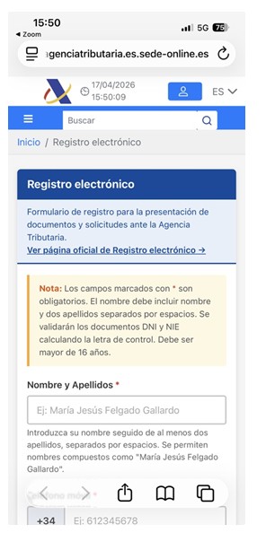 Aparece una pantalla de Registro electrónico, con un formulario electrónico para la presentación de documentos y solicitudes ante la Agencia Tributaria. En primer lugar solicita nombre y apellidos junto con el número de teléfono móvil.