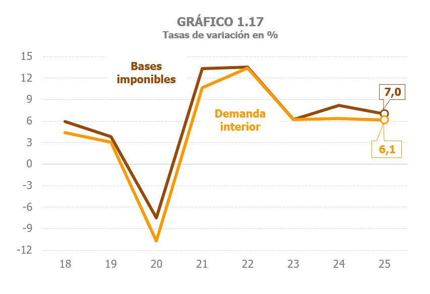 Se estima que la base imponible agregada de los principales impuestos creció un 7% en 2025, lo que supuso una moderación de algo más de un punto respecto a la tasa alcanzada el año anterior (Cuadro 1.3). Se enlazan así tres años con un incremento medio de la base imponible agregada del 7%. El mismo perfil de desaceleración se observó, como se ha visto, en la actividad económica. El crecimiento del PIB, tanto en términos reales como en nominales, se moderó en algo menos de un punto respecto a 2024. En la demanda interior, variable nominal más relacionada con la evolución de la base imponible agregada que el PIB, también se reflejó ese menor ritmo de avance, aunque con menor intensidad (el año cerró con un aumento solo tres décimas inferior al de 2024). El Gráfico 1.17 ilustra esa relación entre las bases y la demanda interior estimada por la Contabilidad Nacional.