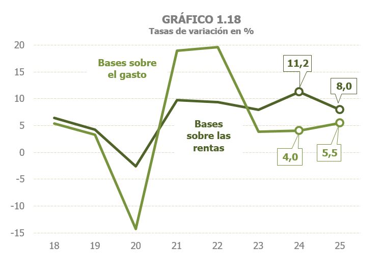Las rentas brutas de los hogares crecieron un 7,2%, 1,7 puntos por debajo del 8,9% del año anterior, mientras que la base imponible del Impuesto sobre Sociedades aumentó un 11,6%, tasa que, aun siendo elevada, es menor que el 23,1% alcanzado un año antes, repunte que estuvo motivado por cambios normativos. Como resultado, las bases sobre las rentas aumentaron un 8%, lo que supuso una pérdida de más de tres puntos respecto al 11,2% de 2024. Por su parte, las bases asociadas al gasto crecieron un 5,5%, superando en un punto y medio el registro del año previo (Gráfico 1.18). El gasto sujeto a IVA aumentó un 6,1%, frente al 5,7% de 2024, gracias al ligero avance de su componente en términos reales y con práctica estabilidad en el avance del deflactor. El valor de los consumos sujetos a II. EE. volvió a tasas positivas, tras dos años de caídas. El incremento del 1,4% se basó en los mayores consumos de carburantes y electricidad y en los mayores precios de las labores del tabaco y de la electricidad, en ambos casos acrecentados por subidas de tipos.