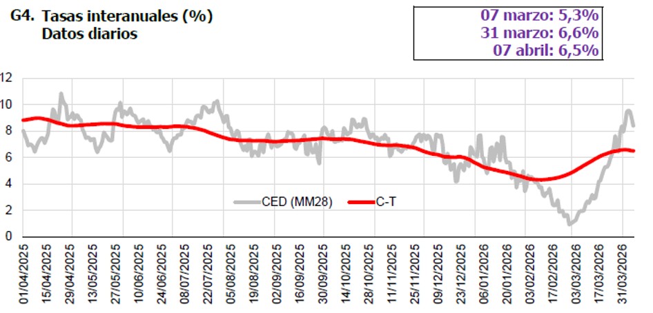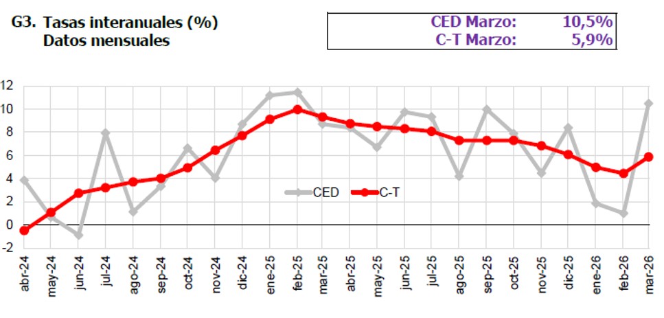 Otra forma de limpiar el ruido, que es la utilizada en la publicación del informe semanal de ventas diarias, es atender a la media móvil de 28 días. Se logra tener una visión más clara de lo que realmente está sucediendo, evitando buena parte de los problemas derivados de las peculiaridades del calendario, mucho mayores en estos datos que en cualquier otra frecuencia. Sin embargo, con esa media, incluso corregida de efectos deterministas, todavía no se alcanza una señal tan inequívoca como se consigue en las series mensuales o trimestrales cuando, mediante técnicas estadísticas más o menos sofisticadas, se calcula la ciclo-tendencia de la serie. Comparando las dos series en rojo de los dos gráficos siguientes extraídos, el primero, del informe semanal de ventas diarias y, el segundo, del informe mensual de Grandes Empresas, se ve la diferencia.