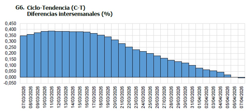 Este nuevo informe complementa la información semanal de ventas diarias con dos novedades: tiene información de las ventas interiores con un retardo de tan solo una semana (frente a las dos del informe semanal completo) y se estima la señal tendencial. Esta última permite una mejor visualización de la evolución subyacente de las ventas y hace posible el cálculo de las variaciones de muy corto plazo (diferencias interdiarias e intersemanales).