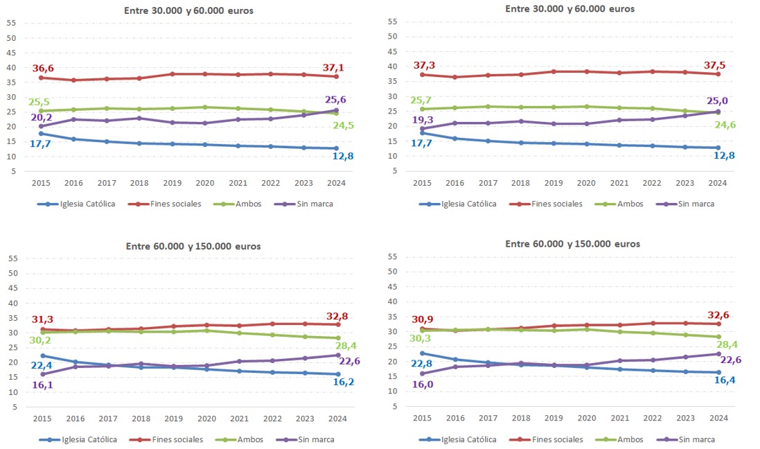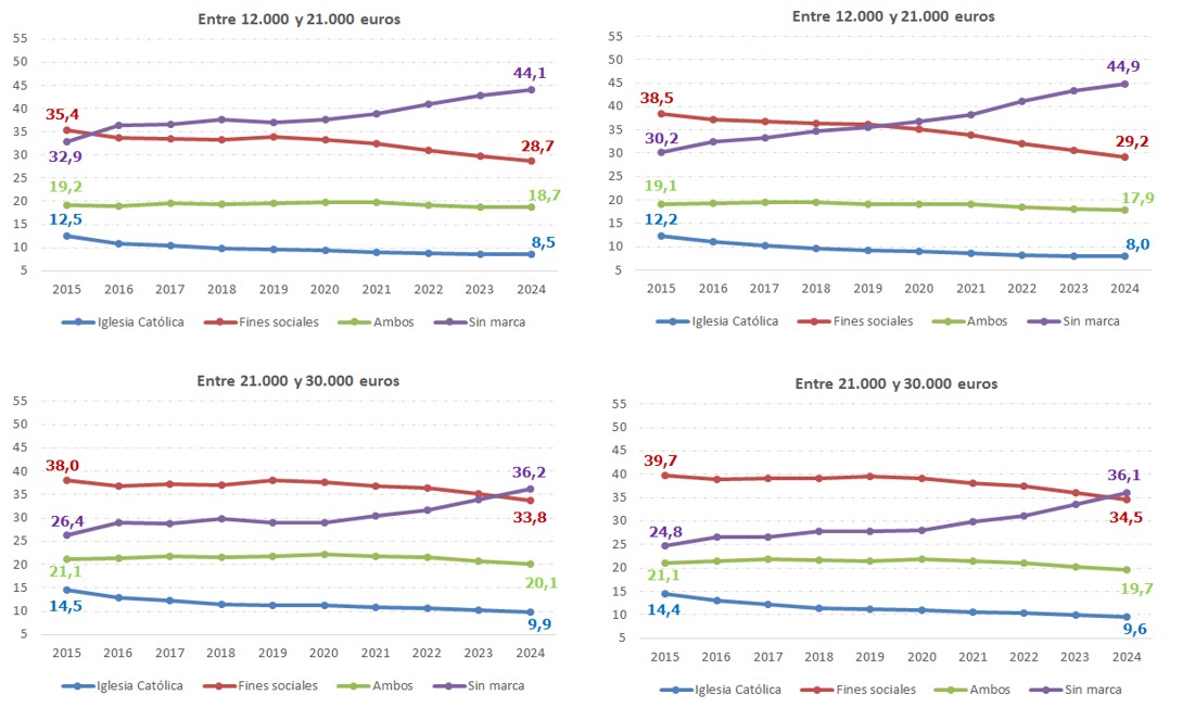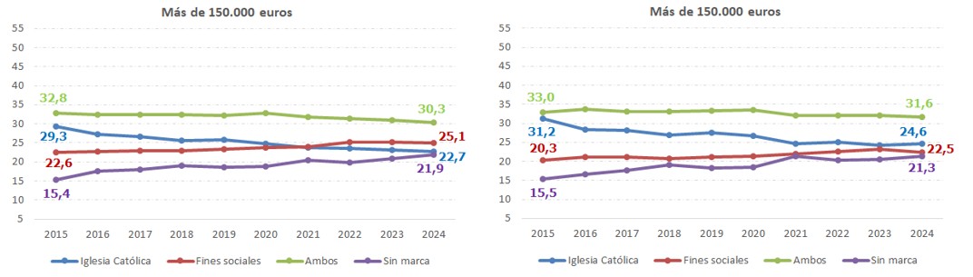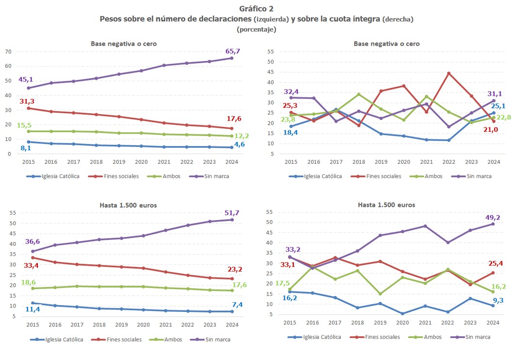 Por su parte, la asignación a la Iglesia Católica muestra una clara trayectoria decreciente a lo largo de todo el periodo, pasando de ser la segunda opción más elegida por los declarantes de IRPF en términos de cuota íntegra (la tercera en términos del número de declaraciones), con un peso del 28,5% sobre el total de la cuota en 2007, a ser la opción minoritaria (entre los ejercicios 2013 y 2015), situándose su peso sobre el total de la cuota íntegra en el 15,4% en 2024 y representado sólo un 10,1% del número de declaraciones. Una trayectoria contraria ha seguido la opción de marcar ambas casillas en la declaración, tanto desde la perspectiva del número de declaraciones como desde la del peso sobre la cuota íntegra. Esta alternativa empezó siendo la menos elegida en 2007, y fue ganando peso hasta el ejercicio 2020, año a partir del cual ha ido perdiendo relevancia de forma paulatina, a favor de la opción Sin marca.