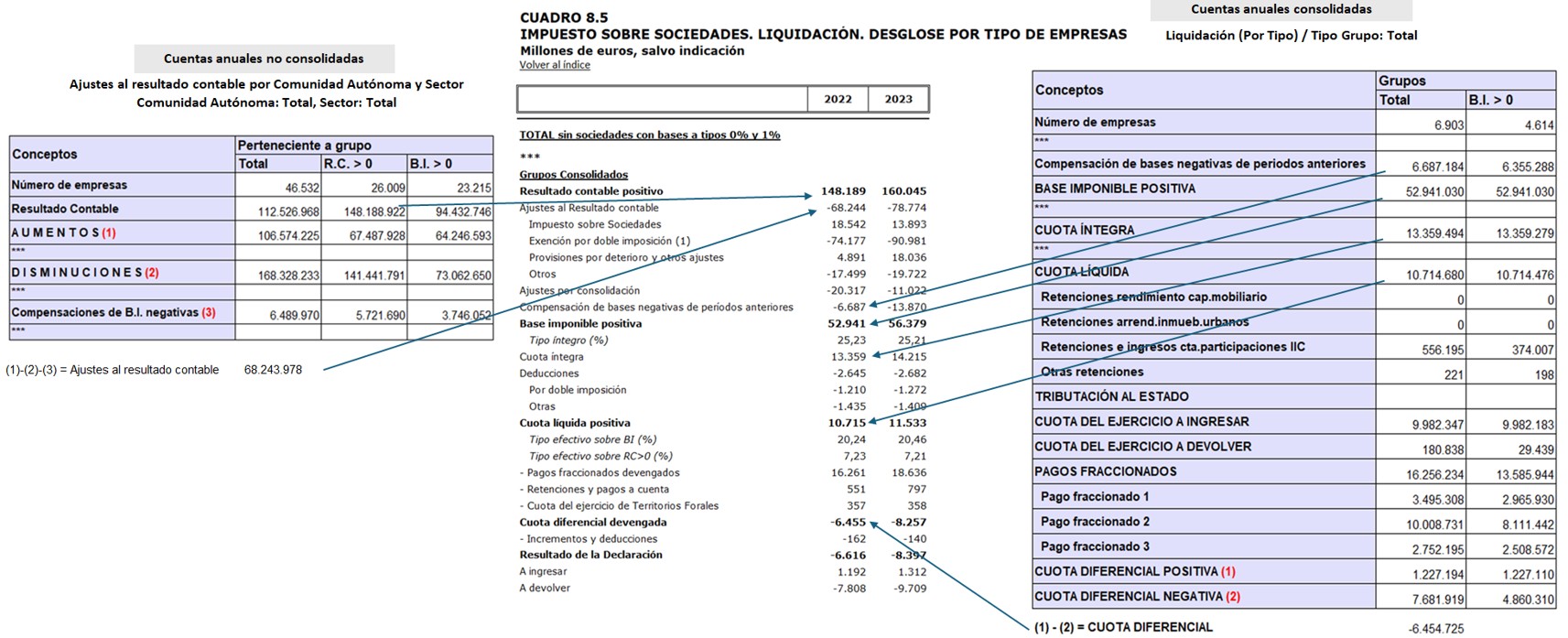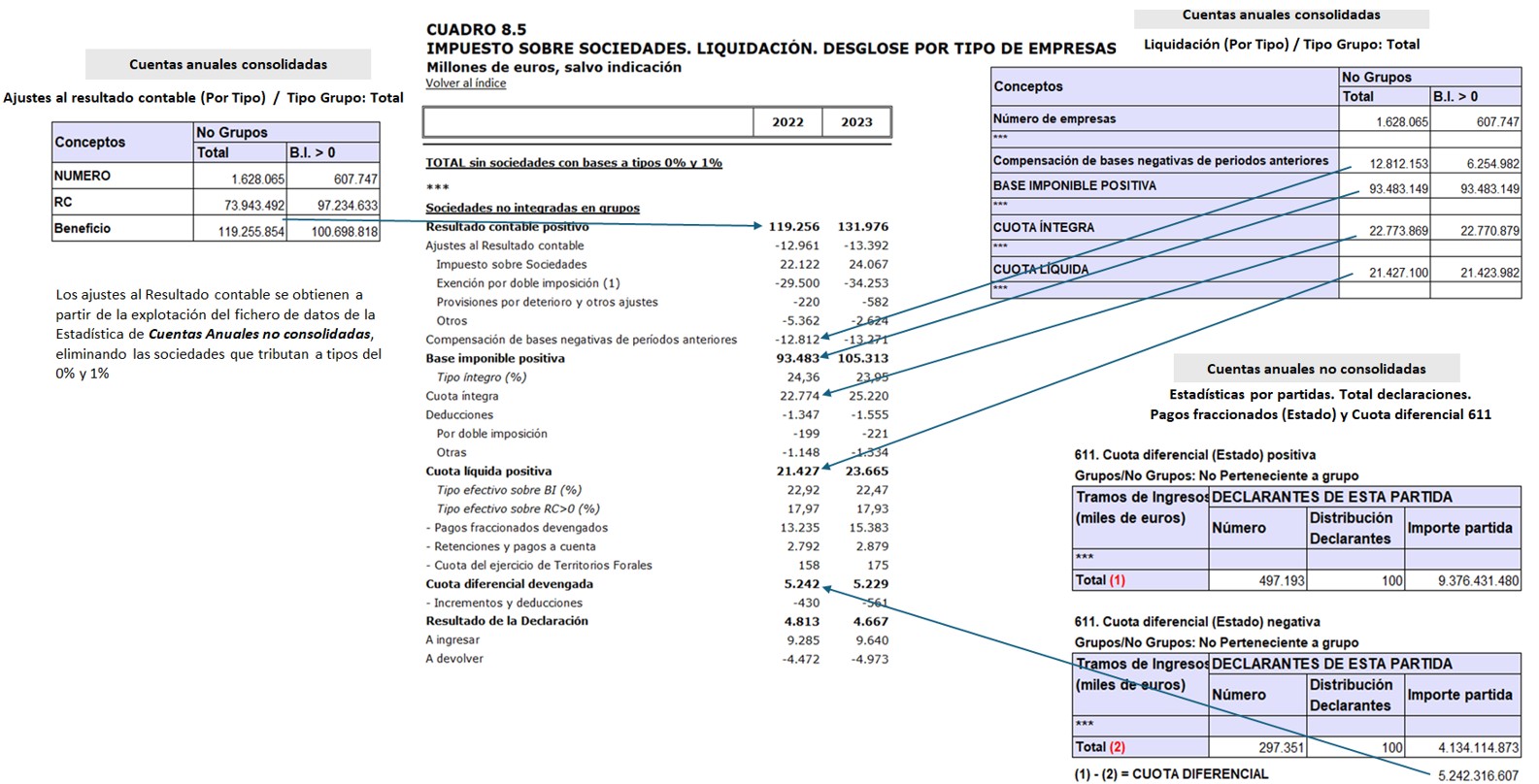 Desde la publicación del IART de 2024, el cuadro 8.4 incorpora un bloque en el que se recoge el resultado contable sin incluir a las sociedades con bases a tipos del 0% y 1%, que pasa a ser la partida inicial del Cuadro 8.5, donde se resume la liquidación del impuesto. La razón de este cambio (antes el cuadro 8.5 se iniciaba con el resultado contable positivo total) es el irregular comportamiento de los beneficios de las empresas con bases a tipos del 0% y 1%, casi todas ellas financieras (fondos de pensiones, sociedades de inversión, …), que están vinculados a la valoración de sus activos que, a su vez, depende de los cambios de tipos de interés y de las reacciones de los mercados financieros. Este hecho tiene mucha repercusión sobre la variación de los beneficios, pero apenas afectan al impuesto dada su escasa o nula tributación. La exclusión de estas sociedades aporta coherencia al análisis comparativo de la evolución de los beneficios y de la base imponible del impuesto, y es el criterio usado en la estadística Cuentas anuales consolidadas del Impuesto sobre Sociedades. Por su parte, el cuadro 8.5 muestra la liquidación del impuesto para los dos grupos relevantes, las empresas no pertenecientes a grupos y los grupos consolidados, integrando la información de los modelos 200 y 220.