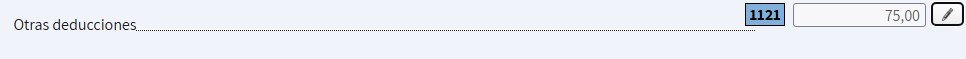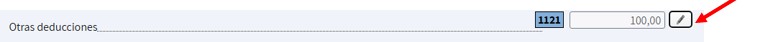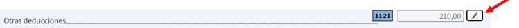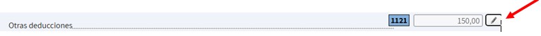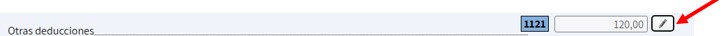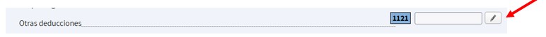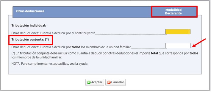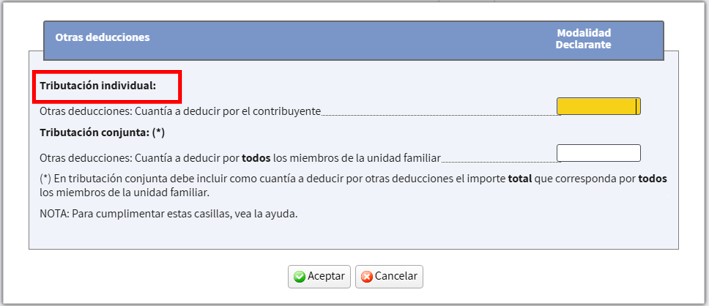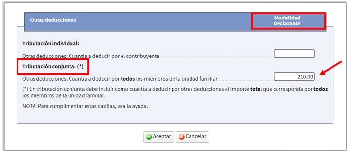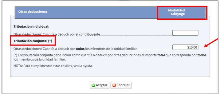 Al ser esta una casella única per a la tributació conjunta l'import total consignat per un dels cònjuges es traslladarà a l'altre. L'import de la deducció al que tenen dret és el que apareix en esta casella en el declarant o en el cònjuge no la suma d'ambdues. Podrà comprovar la quantitat a la que té dret seleccionant en "Modalitat conjunta" la casella (1121) "Altres deduccions".