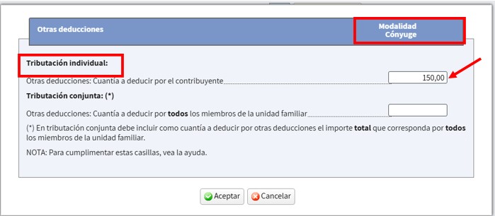 La deducció serà 1.000 euros (2000/2) amb el límit de (150 euros). Per tant, en la casella "Altres deduccions" " Tributació individual” consignarà 150 euros.