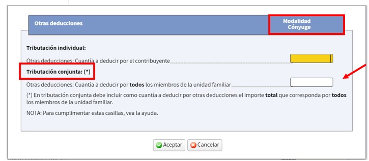 O en “Altres deduccions” de la declaració del cònjuge “Tributació conjunta”.