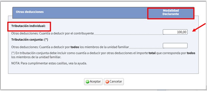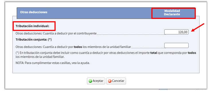 La deducció serà les quantitats satisfetes (100 euros) amb el límit prèviament calculat (120 euros). Per tant, en la casella "Altres deduccions" " Tributació individual” consignarà 100 euros.
