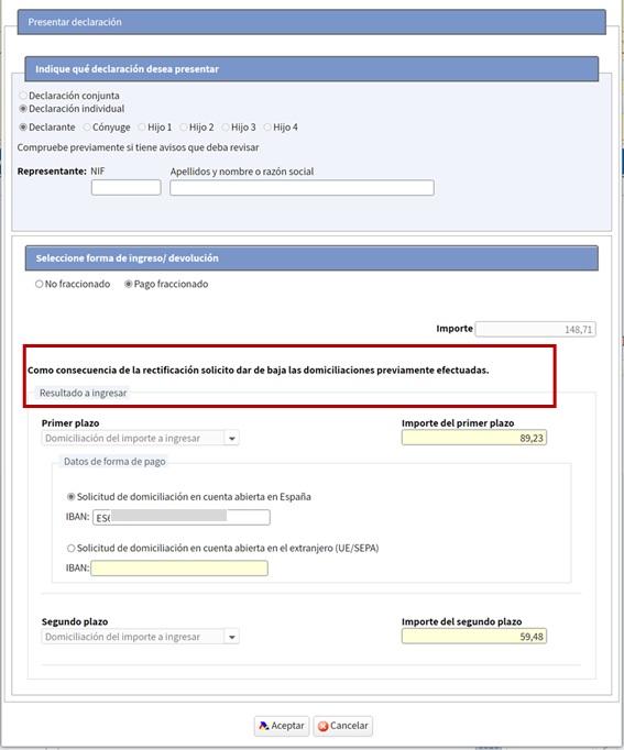 Així, si en l'exemple anterior en el que el resultat de la declaració inicial era de 834,27 € per ingressar i s'havia fraccionat el pagament en dos parts (primer termini del 60% per 500,56 € que s'ingressa i segon termini del 40% que es domicilia), al realitzar la rectificació resulta una quantitat per ingressar de 464,27 €: