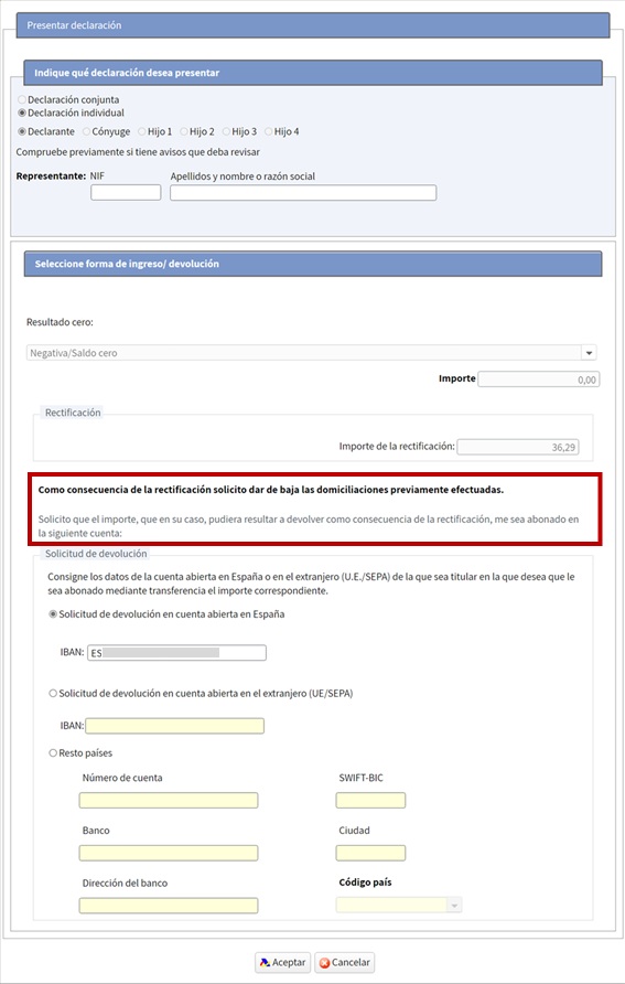 En cas que el resultat final després de la modificació de la declaració anara inferior als ingressos efectius ja realitzats pel contribuent, Renda Web calcularà l'import de l'excés ingressat per a tramitar la seua devolució.